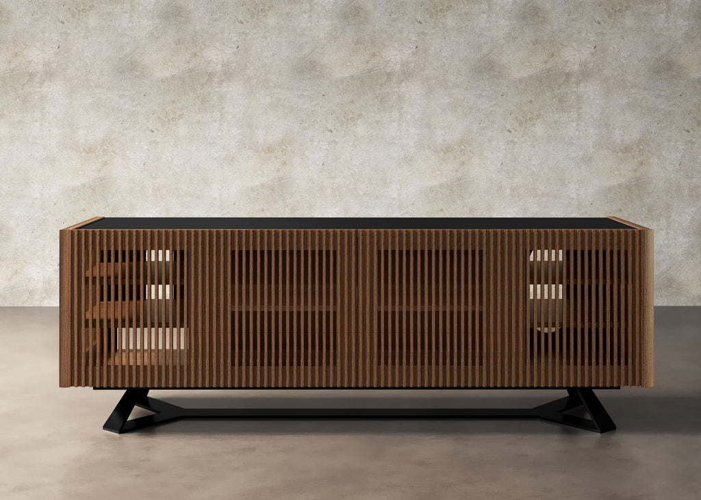 Model DANIELLE-C-BRC is a Chocolate Brown 86” Media Console/Buffet that Marcos Troes designed employing solid Brazilian cherry wood slats, MDF, and glass.