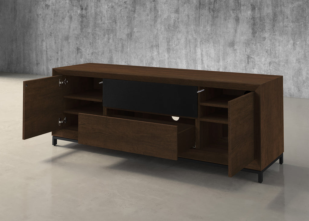 This 86-inch versatile TV stand/media console combines the warmth of American red oak, finished in a stunning CHOCOLATE BROWN finish, with contoured edge detail and wood doors. This unique contemporary entertainment center is a perfect complement to today’s flat-screen and audio-video technology.